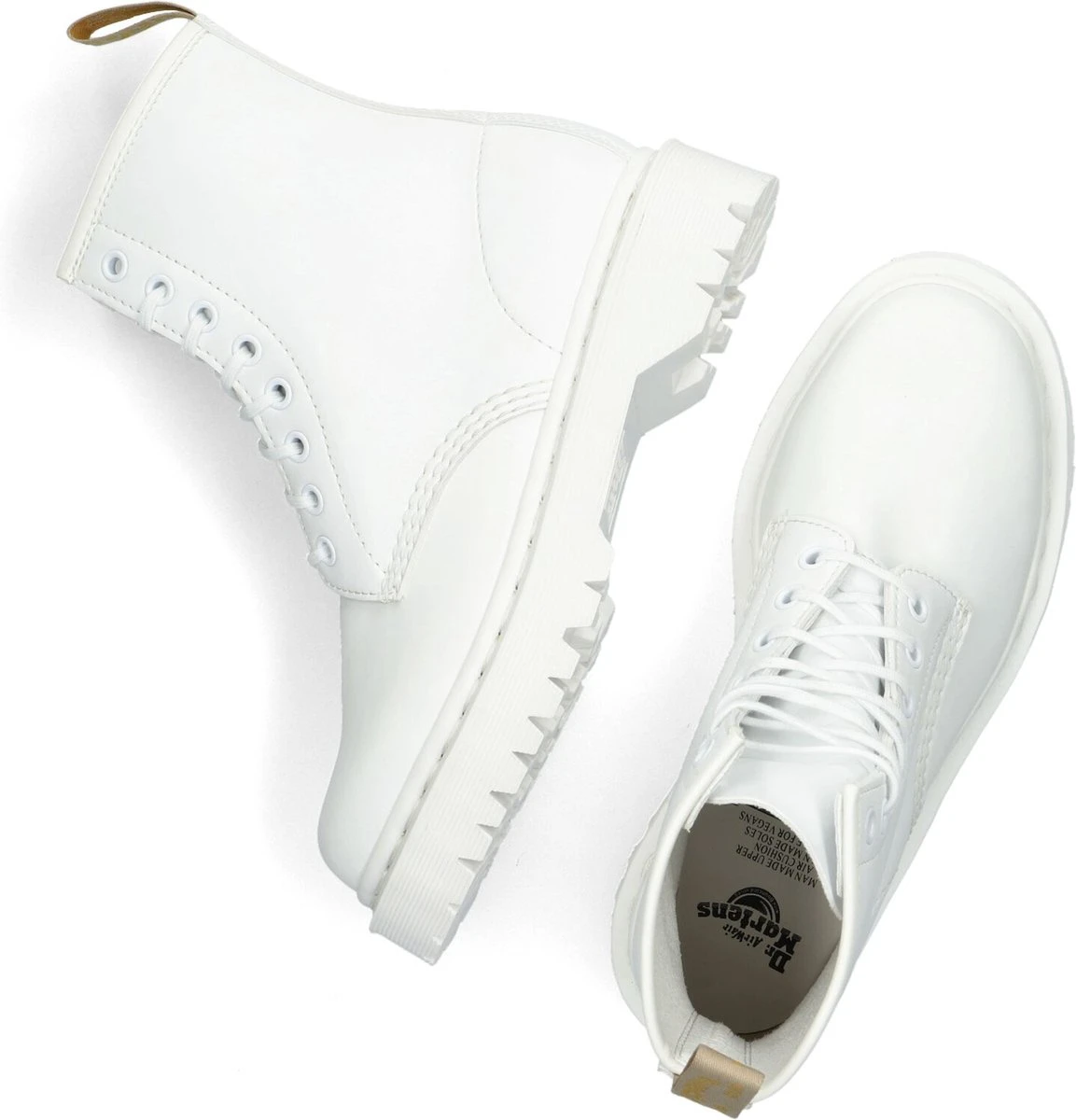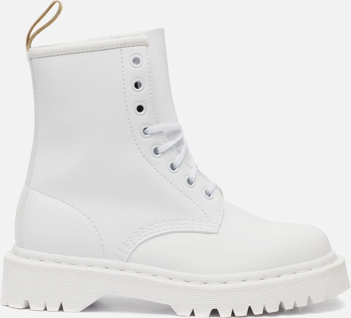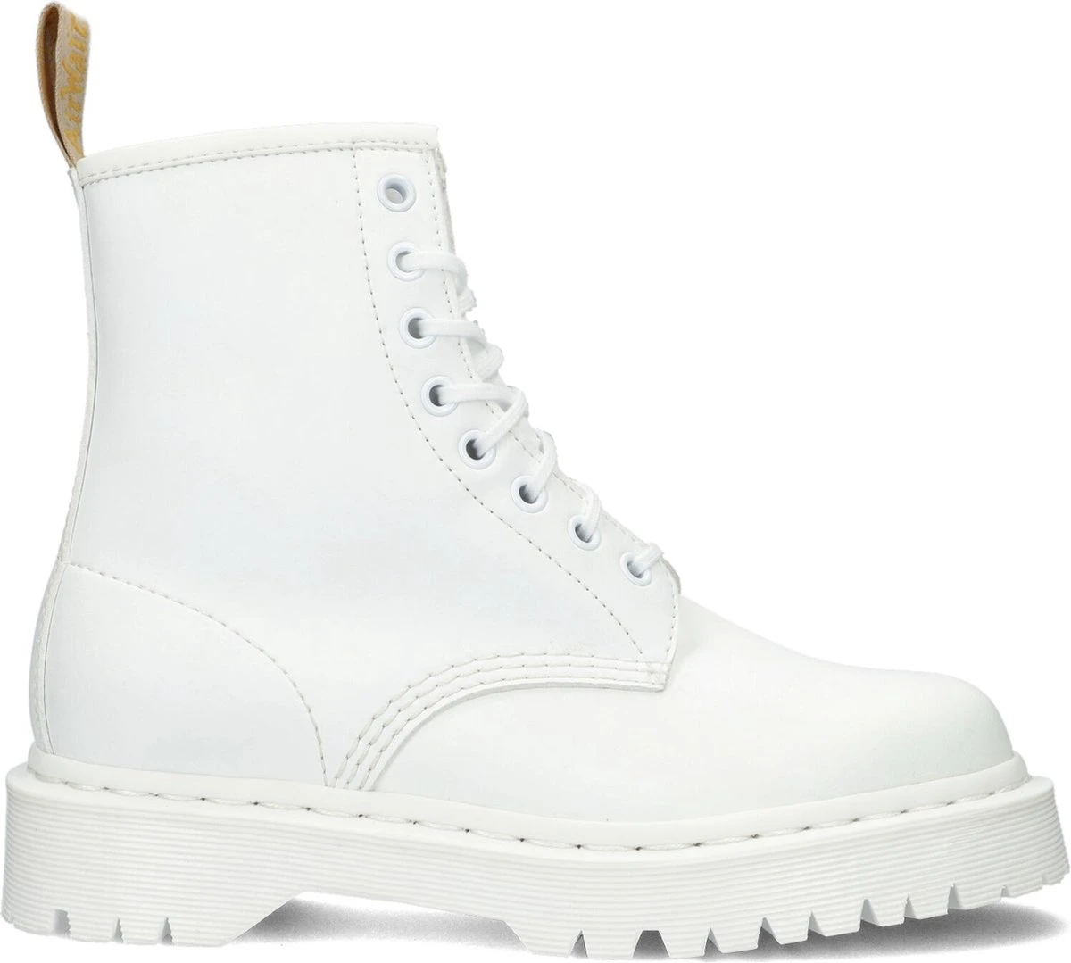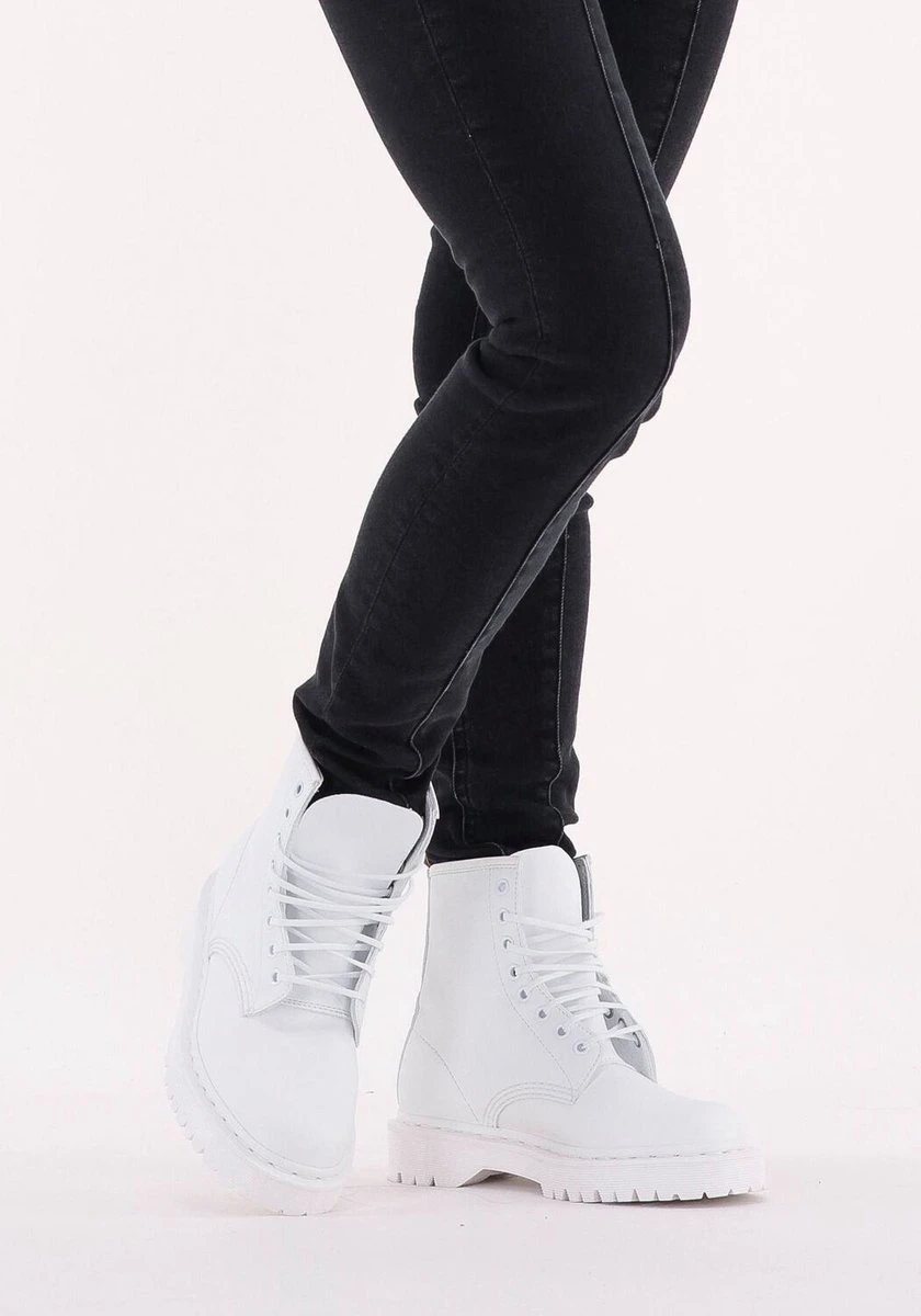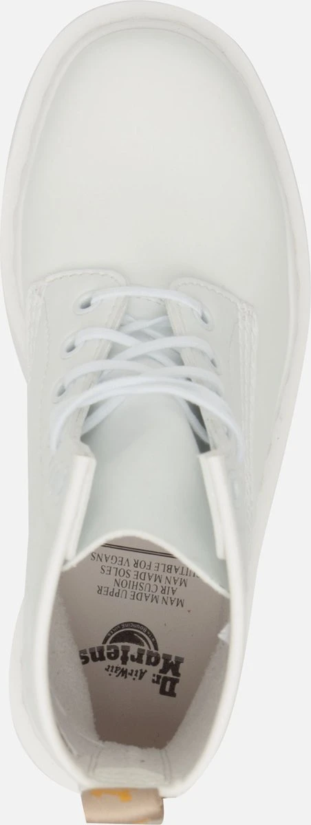Trakteer je voeten op originele veterboots Vegan 1460 BEX Mono van Dr. Martens! Dit model is uitgevoerd in veganistisch, wit leer en heeft een opvallende aantreklus op de achterkant van de schacht. Daarnaast is dit model voorzien van witte veterringetjes, een wit stiksel rondom de zoolrand, ribbeltjesreliëf op de zoolrand en dubbele stiksels voor een speelse look. De boot is gevoerd met veganistisch suèdelook en heeft een vast voetbed met comfortabele demping. De chunky zool heeft een gripvast profiel, waardoor je veel stabiliteit ervaart bij iedere stap. De zool is onder de voorvoet 2,5 centimeter hoog en onder de hiel bijna 4 centimeter. Verder heeft dit item een schachthoogte van 15 centimeter (gemeten bij maat 38). Maatadvies: dit product valt smal en wordt aanbevolen voor smalle tot normale voeten.