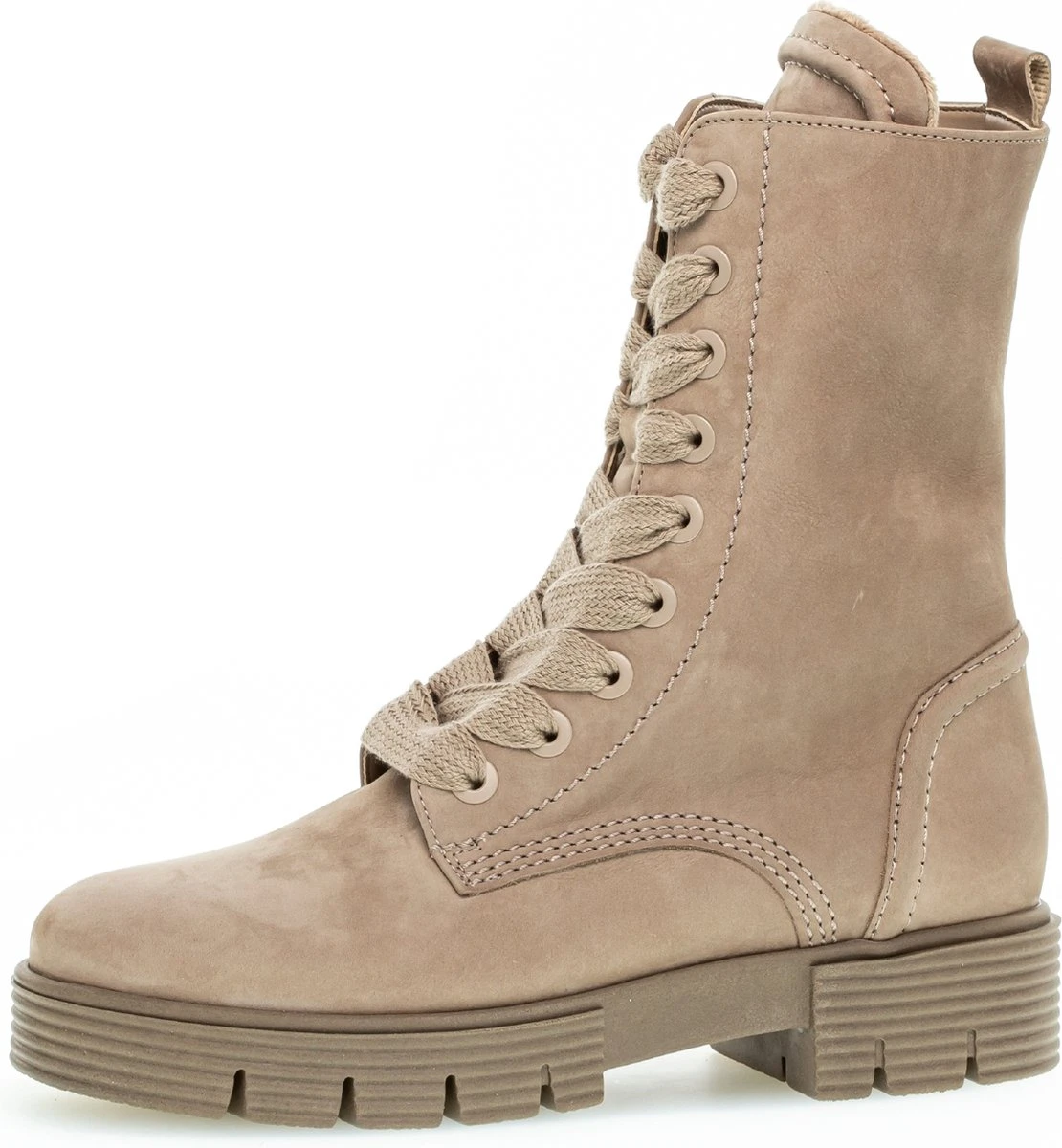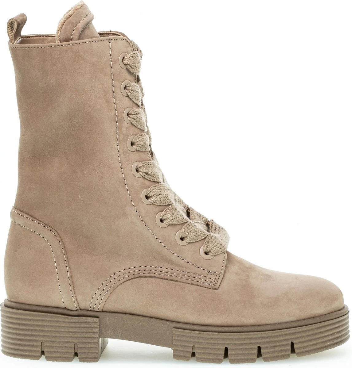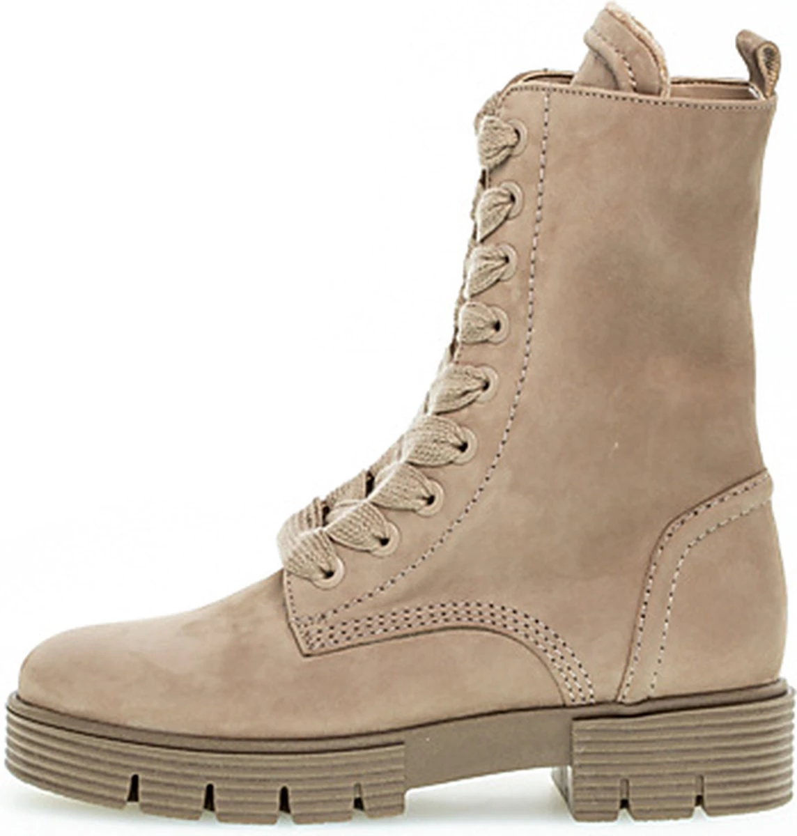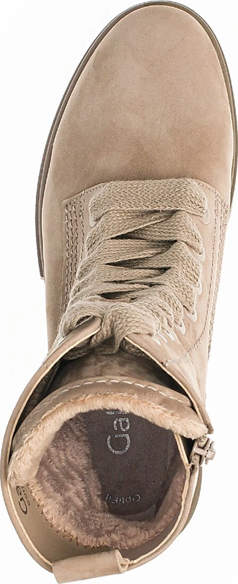 Stoer, vrouwelijk & comfortabel! Dat is deze taupekleurige veterboot 745.4 uit de comfort collectie van het merk Gabor. De schoenen hebben meer volume bij de tenen en bij de bal van de voet en ze bieden de noodzakelijke ruimte. Dit model is uitgevoerd in super zacht nubuckleer met een veter- én ritssluiting om ze gemakkelijk aan- en uit te kunnen doen en aan te passen naar je voet. De boot ziet er stoer uit door de grote veterogen, de diepe groeven in de tussenzool en en de extra versteviging bij de hiel. De laars heeft een binnenvoering van zacht textiel met een uitneembaar voetbed. Dit model heeft een brede H-wijdte en de rubberen zool met slijtvaste loopzool biedt grip en een hoog loopcomfort. De stabiele blokhak heeft een hoogte van 4 centimeter en het plateau onder de voorvoet is 3 centimeter hoog. De schachthoogte is 20 centimeter, gemeten bij maat 38. Match ze onder jouw lievelingsbroek of -jurk en je bent klaar voor een nieuwe, mooie dag!
