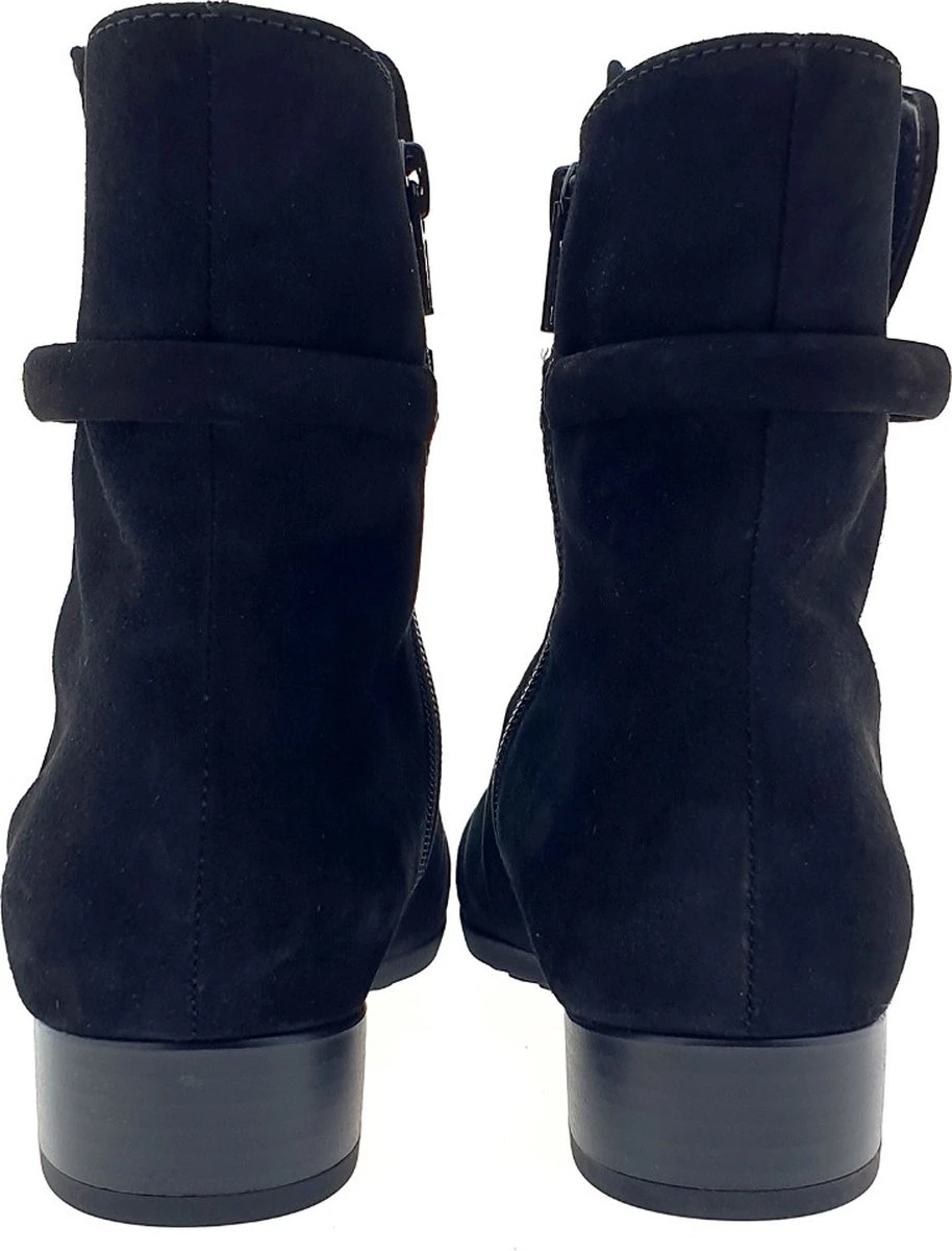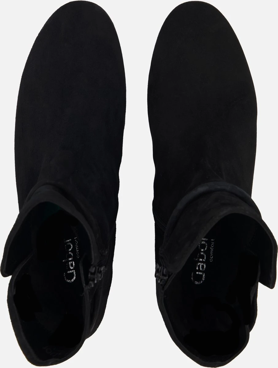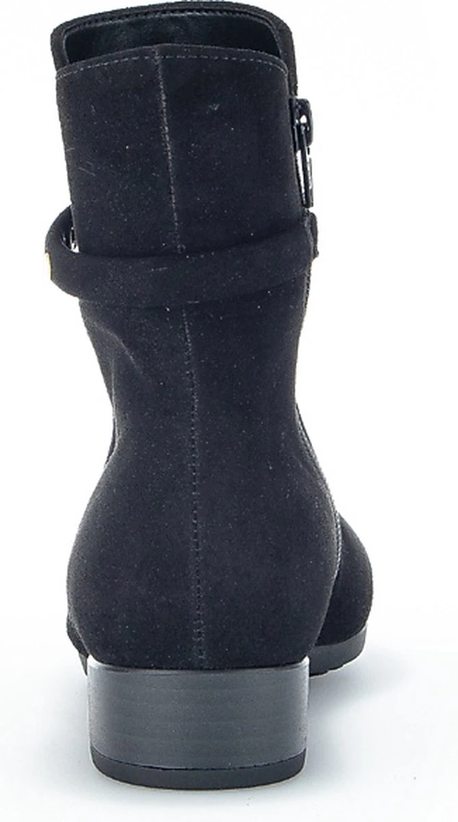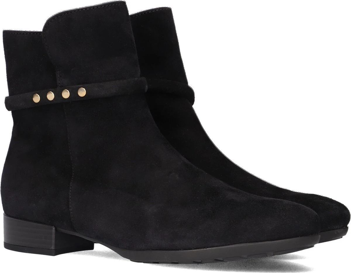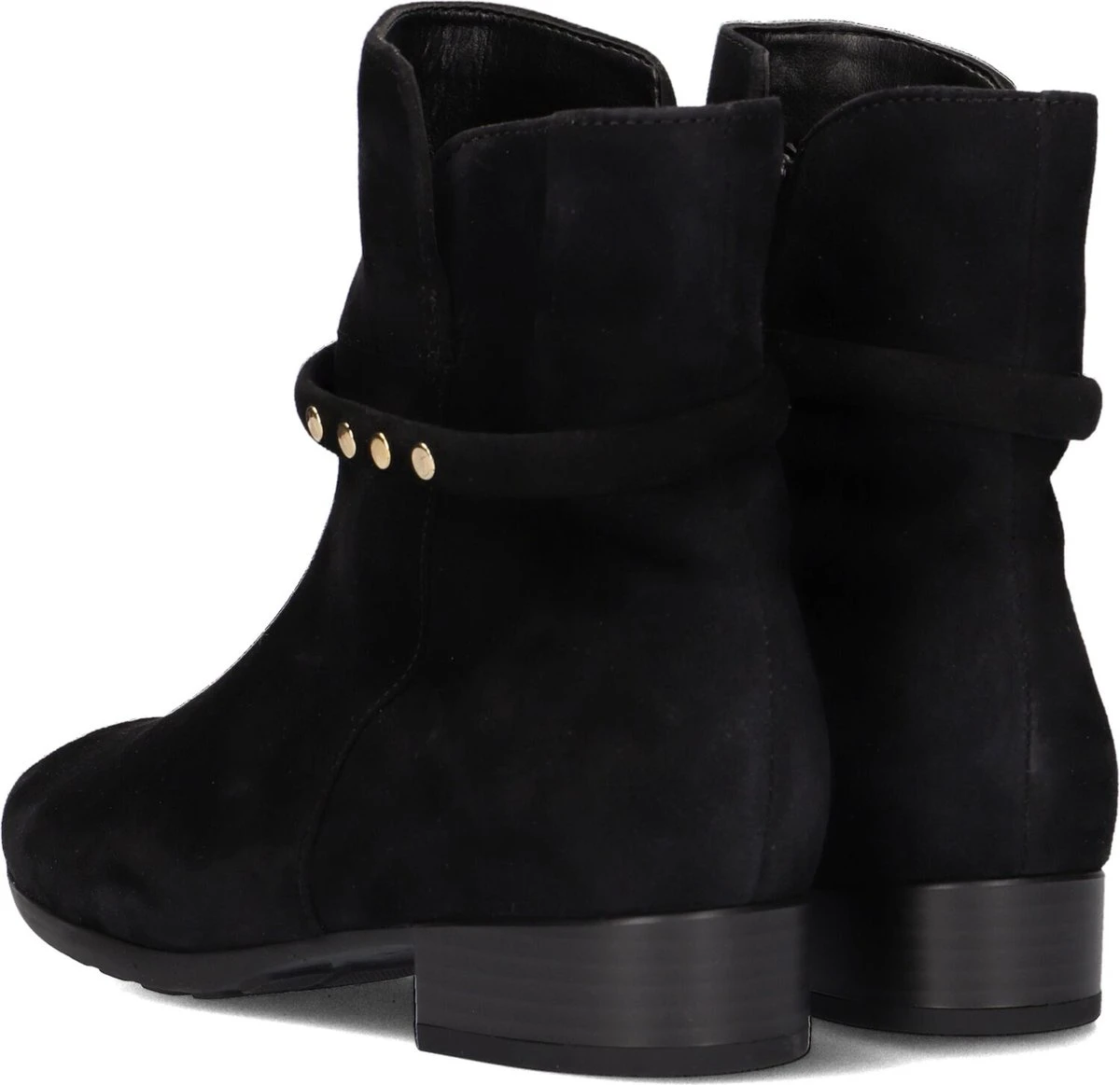 Suède enkellaars voor dames van het merk Gabor. Deze enkellaars met ronde neus is uitgevoerd in zwart suède. De binnenzijde van de schacht bevat een rits en rondom de schacht is een bandje aangebracht met goudkleurige studs. De binnenkant bestaat uit leer en een stevig contrefort draagt bij aan het draagcomfort. De rubberen loopzool heeft een grof profiel en de hak meet circa 2,5 cm.