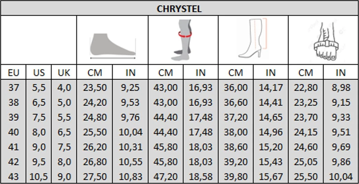 Ons model Chrystel laarzen is gemaakt van hoogwaardig synthetisch leer, heeft een hak van 7 cm en is voorzien van een elastische band aan de bovenzijde van de laars. Enkele decoratieve elementen geven het product een nonchalante stijl. Dit model laarzen is geschikt voor grote kuiten – XL, tussen 43 en 47,20 cm in omtrek. De gebogen en uitneembare binnenzool garandeert optimaal comfort en stelt je in staat om je eigen orthopedische inlegzolen te gebruiken. Een model van elegante laarzen die gemakkelijk elke dag te dragen zijn.