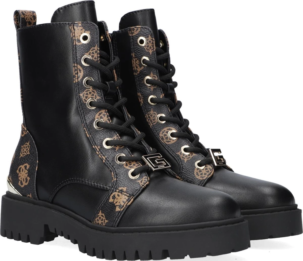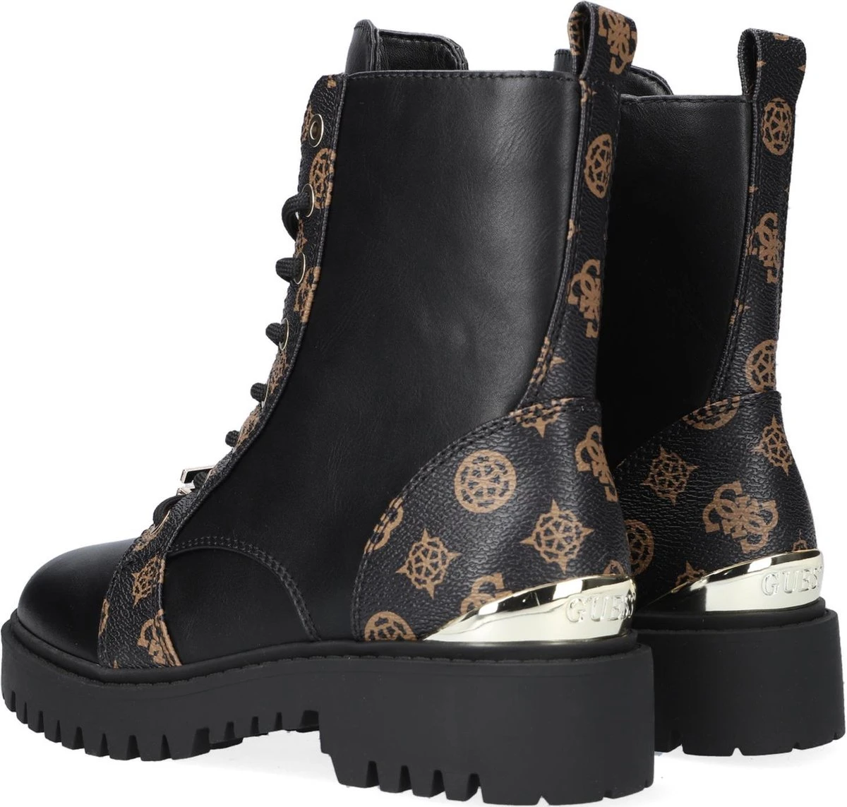 Voeg een beetje glam toe aan je outfit met deze zwarte veterboots Omala uit de collectie van Guess! Het bovenwerk is uitgevoerd in lederlook en heeft een print van lichtbruine merkopdrukken langs de veterklep, de hielcap en de aantreklus. Op de veter bevind zich metallic goudkleurige merkembleem en op de hiel zit een goudkleurige hielstabilisator met merkreliëf. Het binnenwerk heeft een zachte textiel voering met een vast voetbed. De opvallende zool is extra dik en heeft diepe groeven voor superveel grip. Onder de voorvoet is de laars bijna 3 centimeter hoog en de hakhoogte is 4,5 centimeter. Draag deze trendy boots relaxed onder een jeans of nonchalant onder een rokje of jurkje.