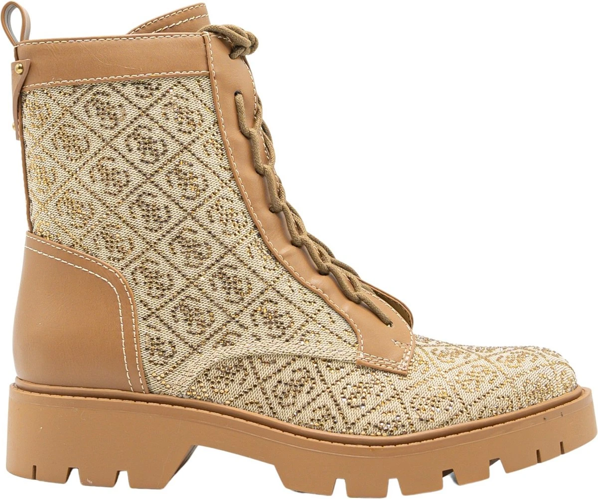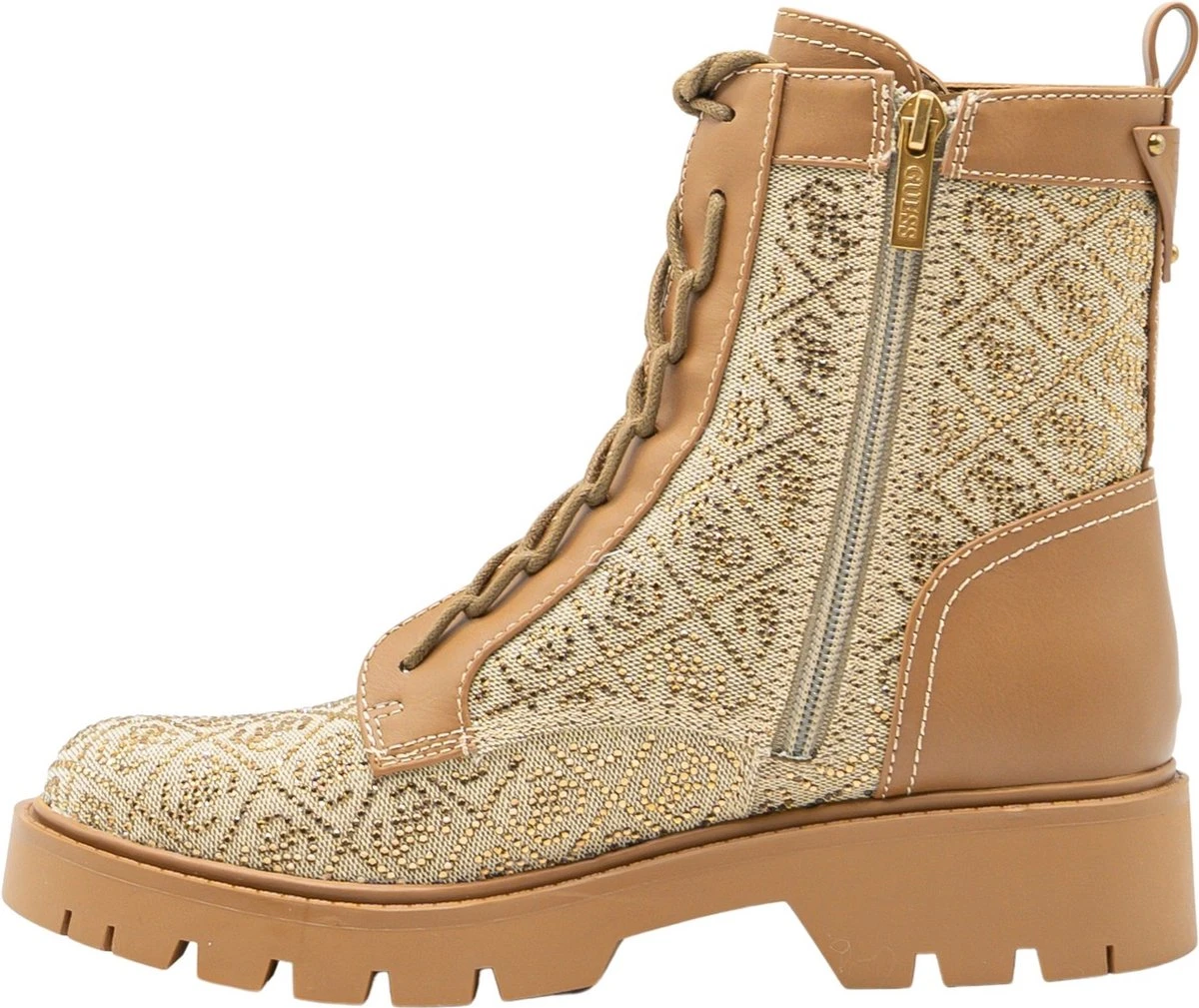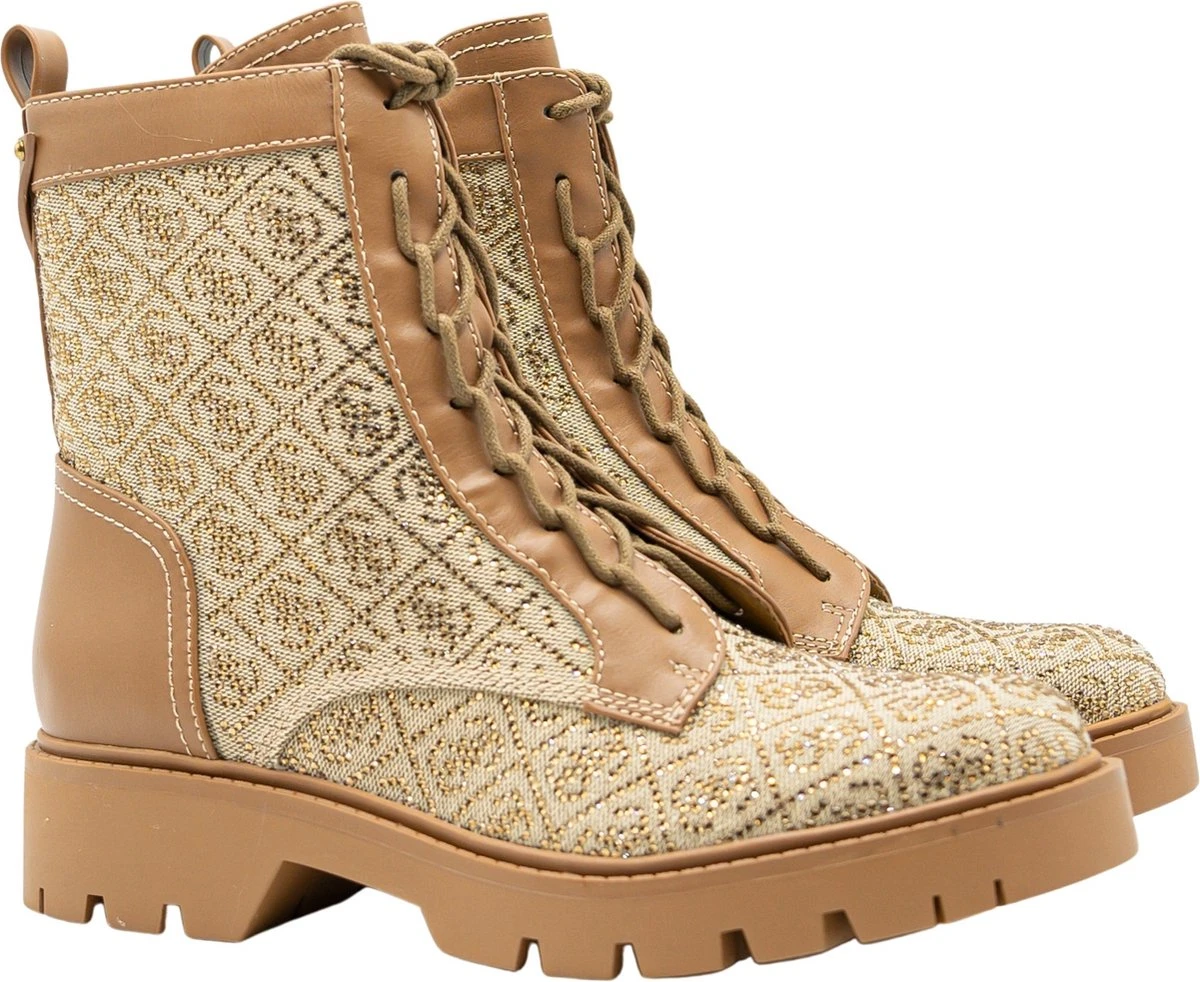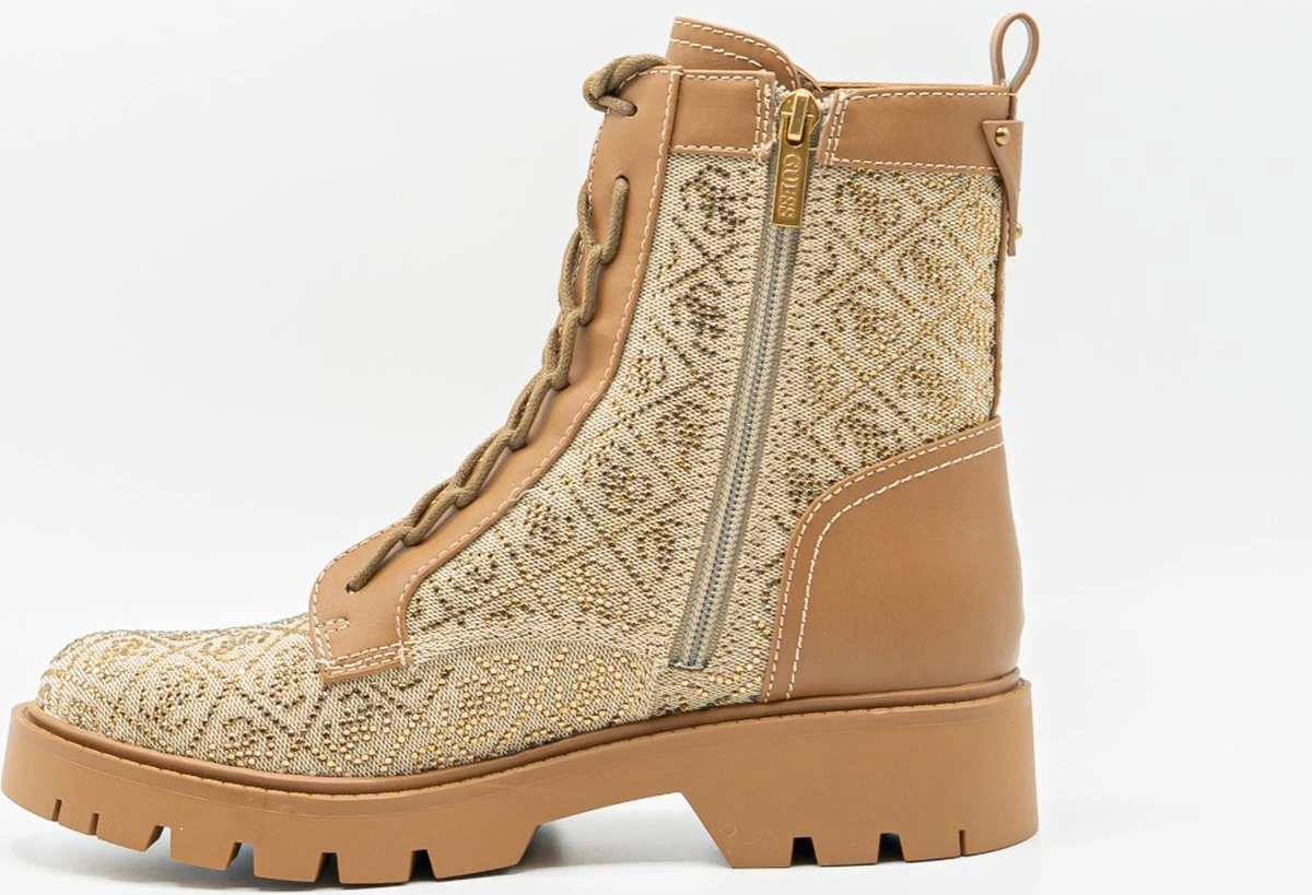 Stoere dames laars afgewerkt met all over logo print uit de nieuwe collectie van Guess. Op de achterzijde zit een klein merklogo afgebeeld in het bruine leer. Super leuk om te combineren met jou favoriete outfits!