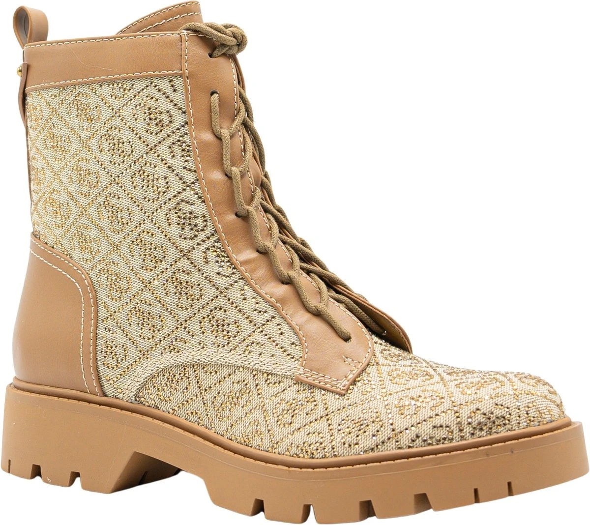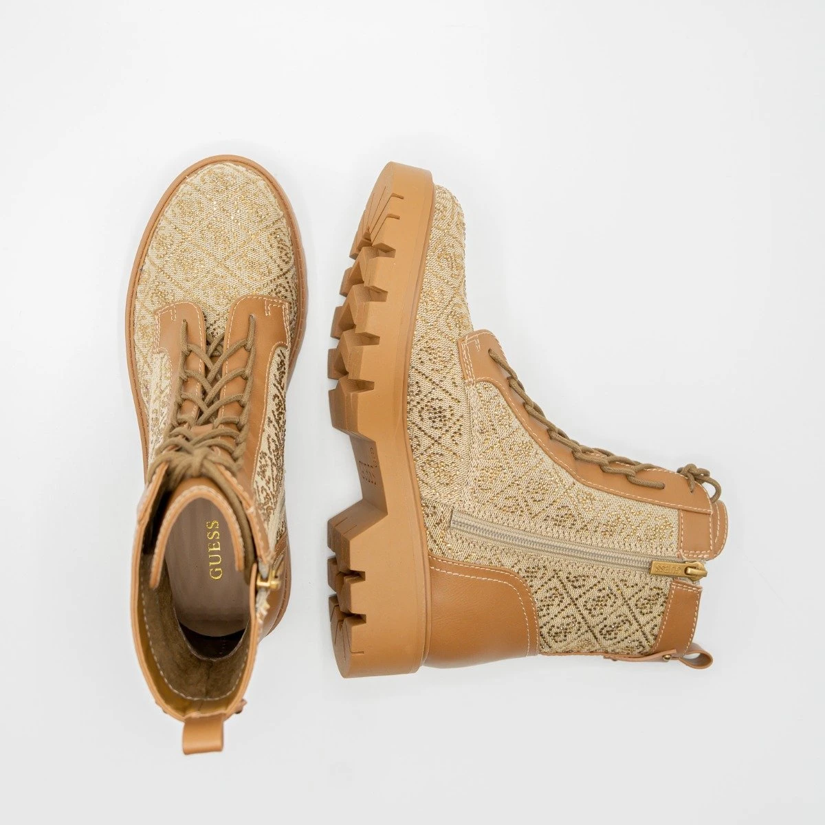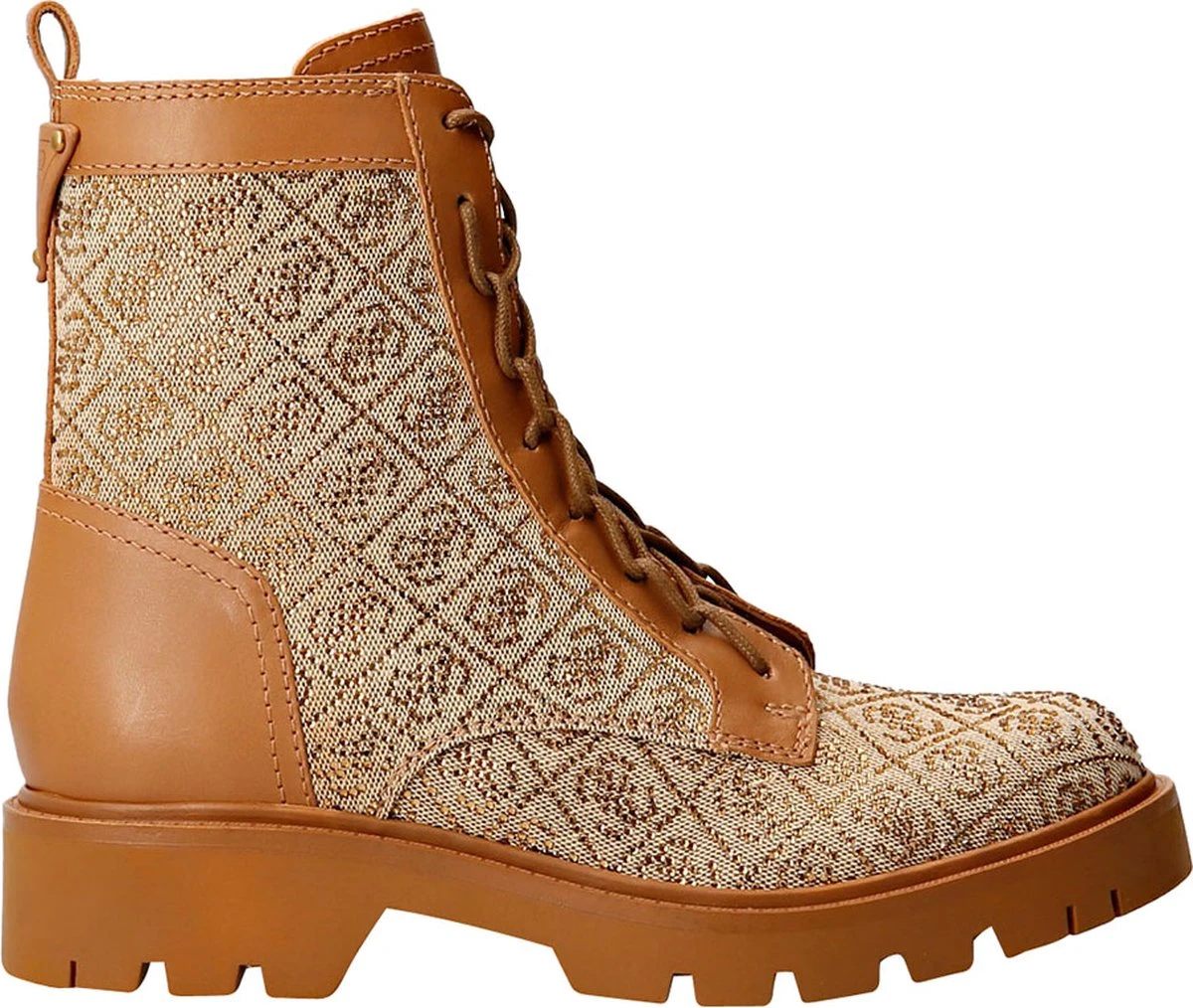 Stoere dames laars afgewerkt met all over logo print uit de nieuwe collectie van Guess. Op de achterzijde zit een klein merklogo afgebeeld in het bruine leer. Super leuk om te combineren met jou favoriete outfits!
