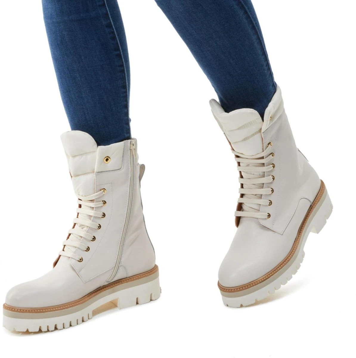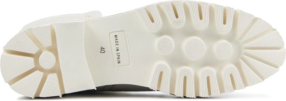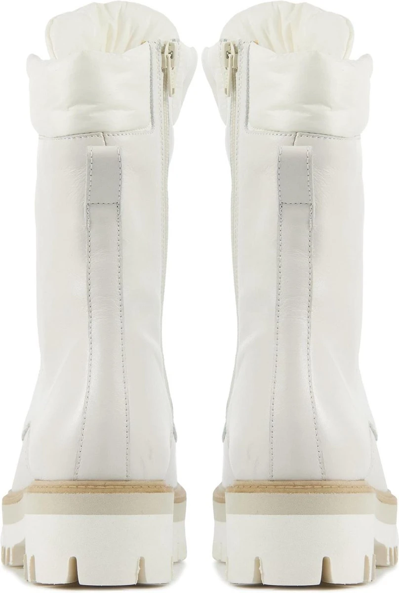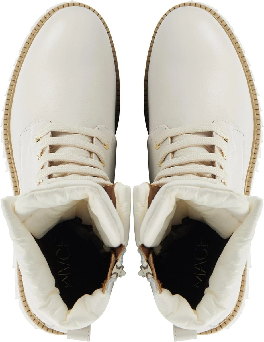 Veterlaars met canvas voor dames van het merk Mace. Deze witte veterlaars is uitgevoerd in leer. De veters zijn door goudkleurige ringen geregen. De bovenzijde en een gedeelte van de tong zijn uitgevoerd in gebroken wit canvas. Naast de veters heeft deze enkellaars ook een rits aan de binnenzijde van schacht. De binnenzijde is uitgevoerd in leer en een stevig contrefort draagt bij aan het loopcomfort. De rubberen zool heeft een grof profiel voor stevige grip.