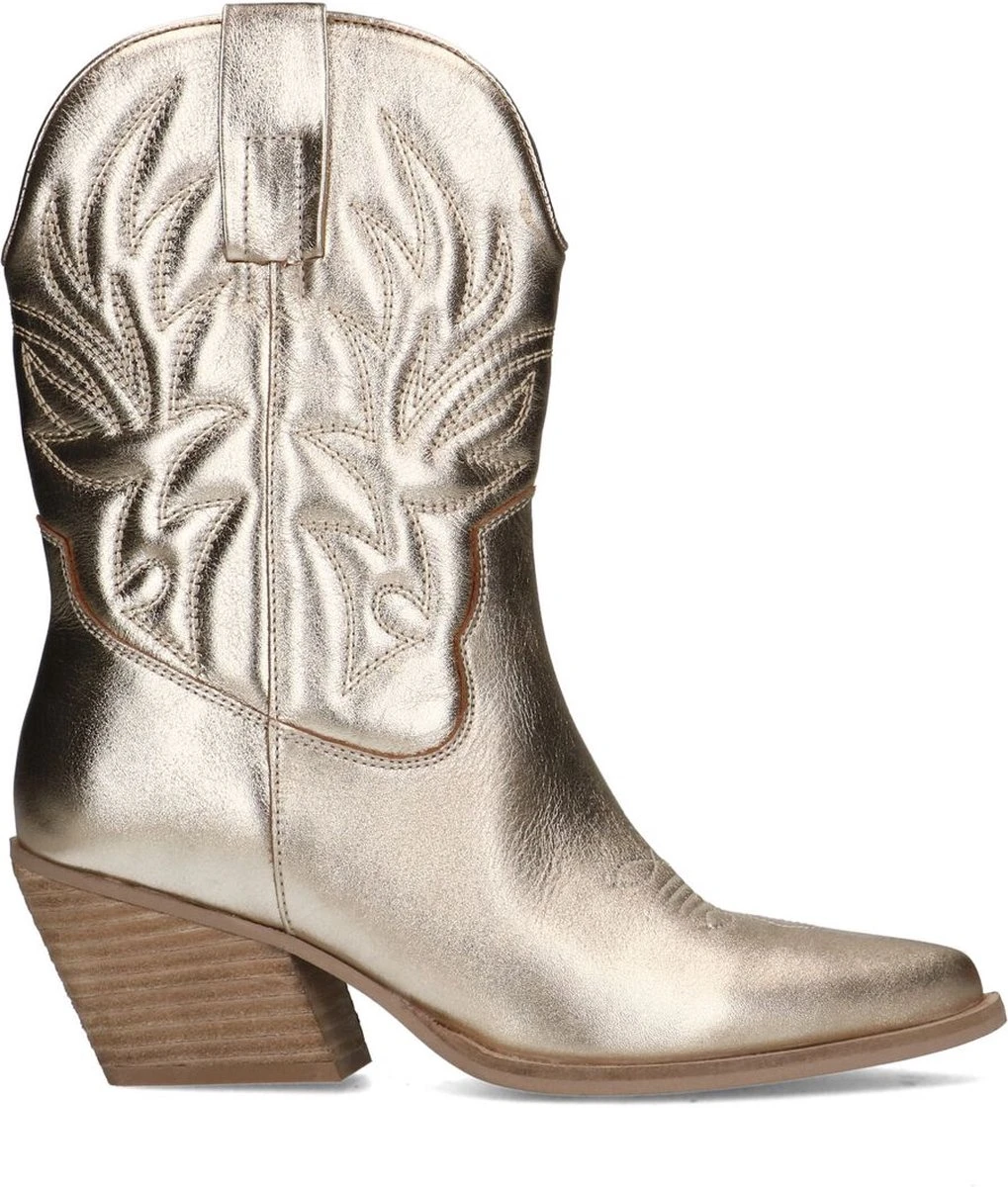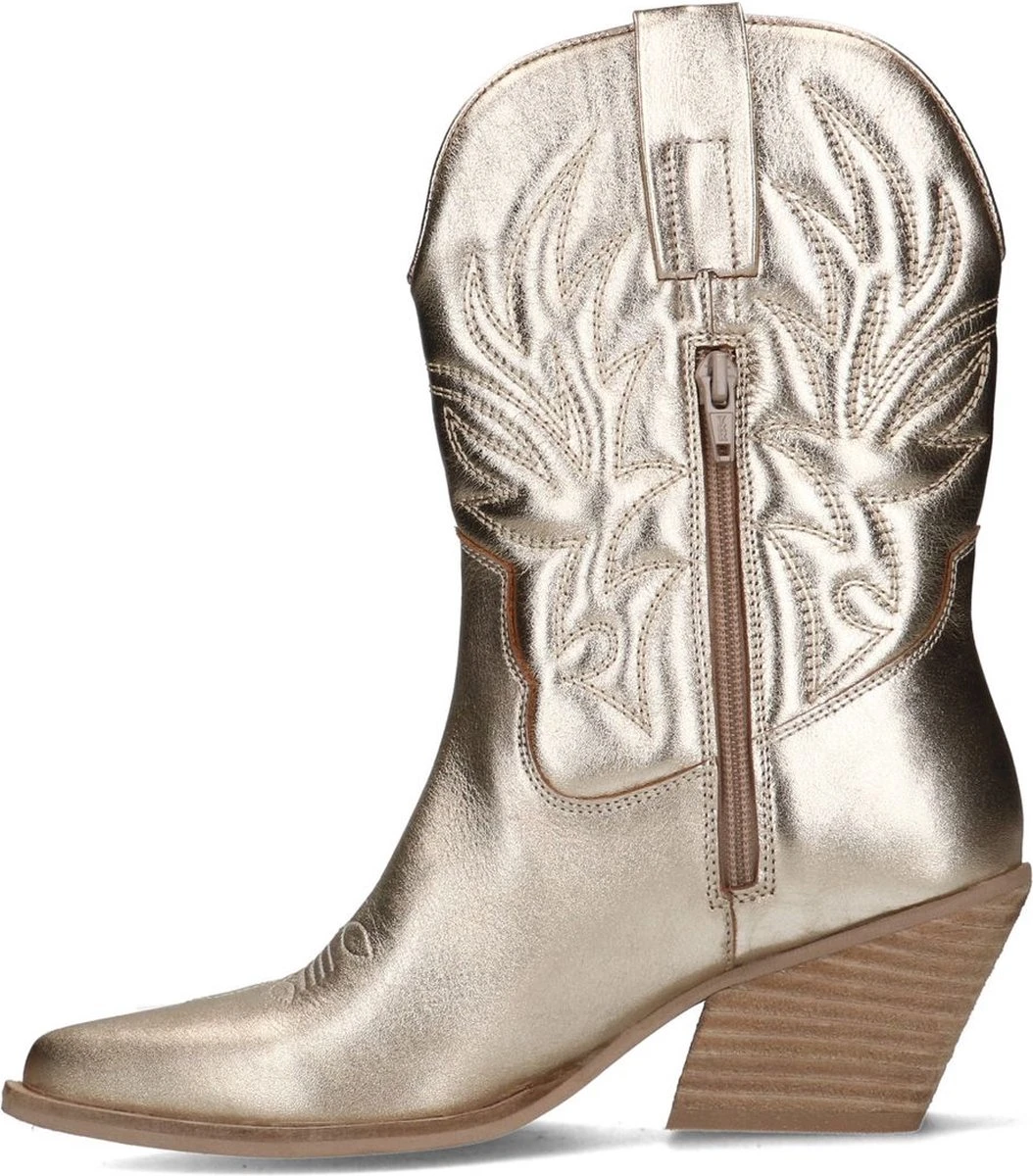 Goudkleurige metallic cowboy laarzen van Manfield. Deze cowboy laarzen zijn gemaakt van leer en zijn voorzien van een metallic kleur. Daarom raden we je aan deze cowboy laarzen te verzorgen en beschermen met de Metallic Spray. Deze metallic western boots zijn perfect het hele jaar door te dragen. De unieke stiksels zorgen voor nét dat beetje extra. De schuin afgesneden blokhak heeft een hoogte van 7 cm.
