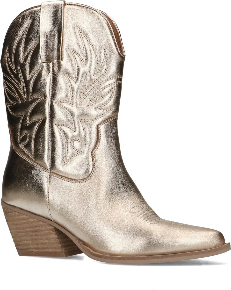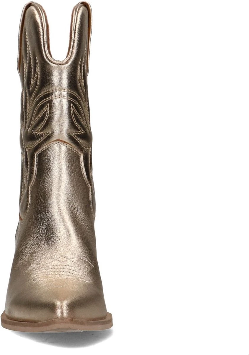Goudkleurige metallic cowboy laarzen van Manfield. Deze cowboy laarzen zijn gemaakt van leer en zijn voorzien van een metallic kleur. Daarom raden we je aan deze cowboy laarzen te verzorgen en beschermen met de Metallic Spray. Deze metallic western boots zijn perfect het hele jaar door te dragen. De unieke stiksels zorgen voor nét dat beetje extra. De schuin afgesneden blokhak heeft een hoogte van 7 cm.