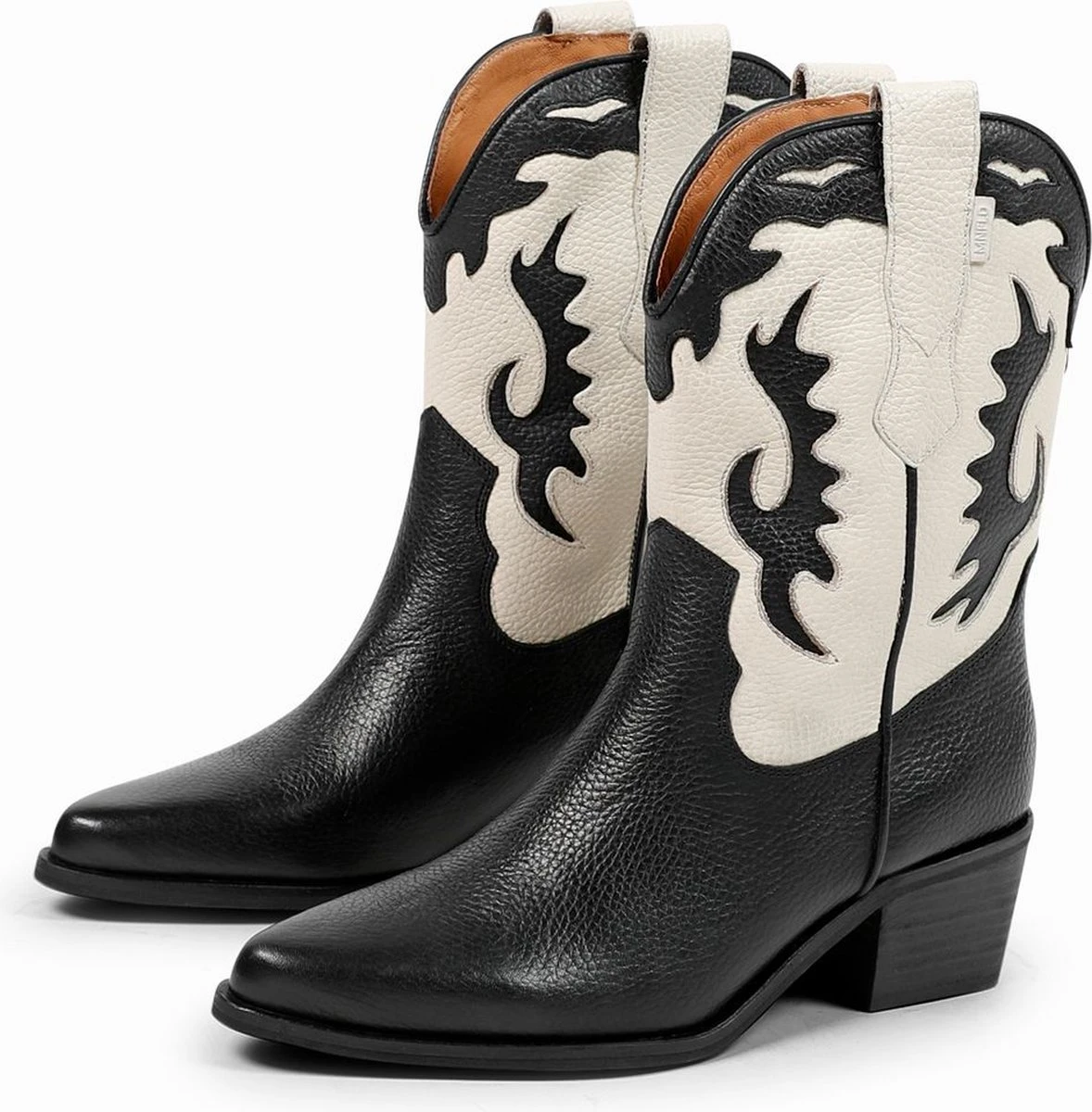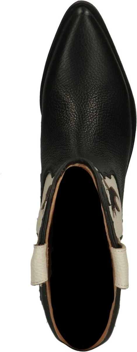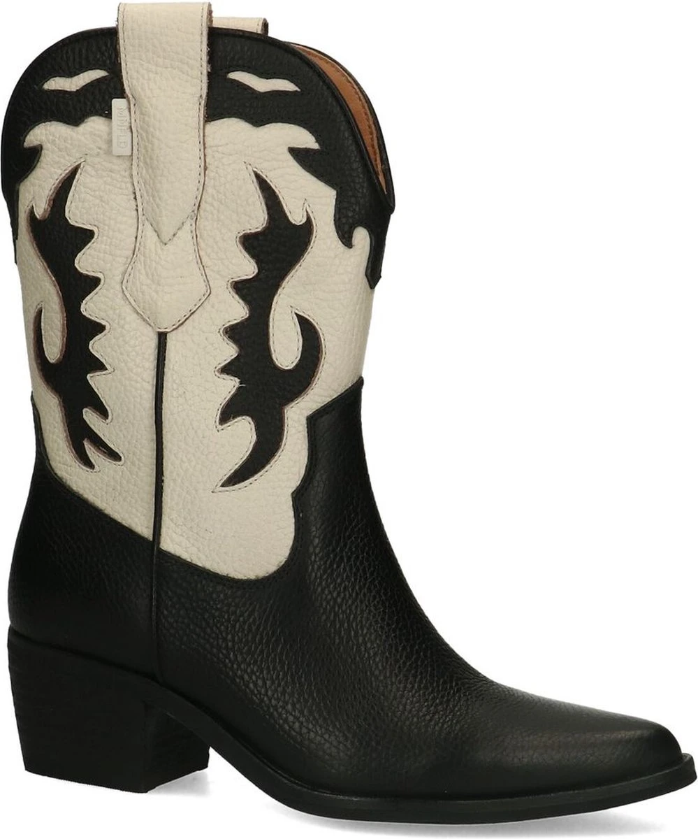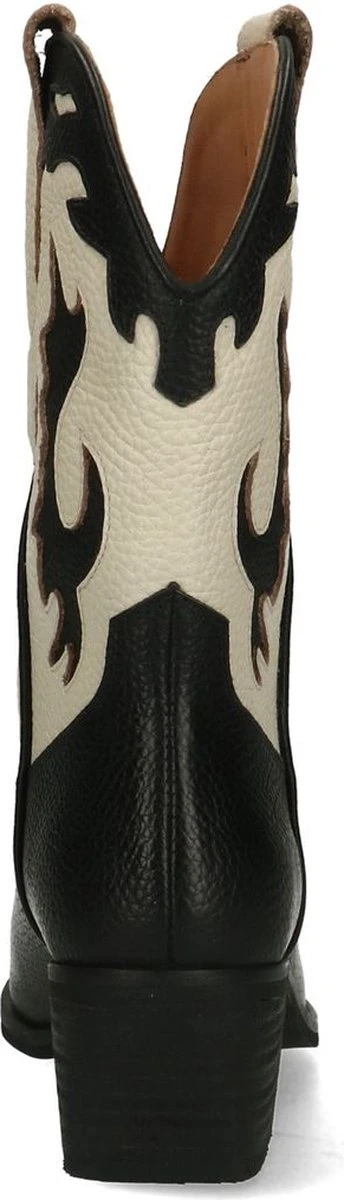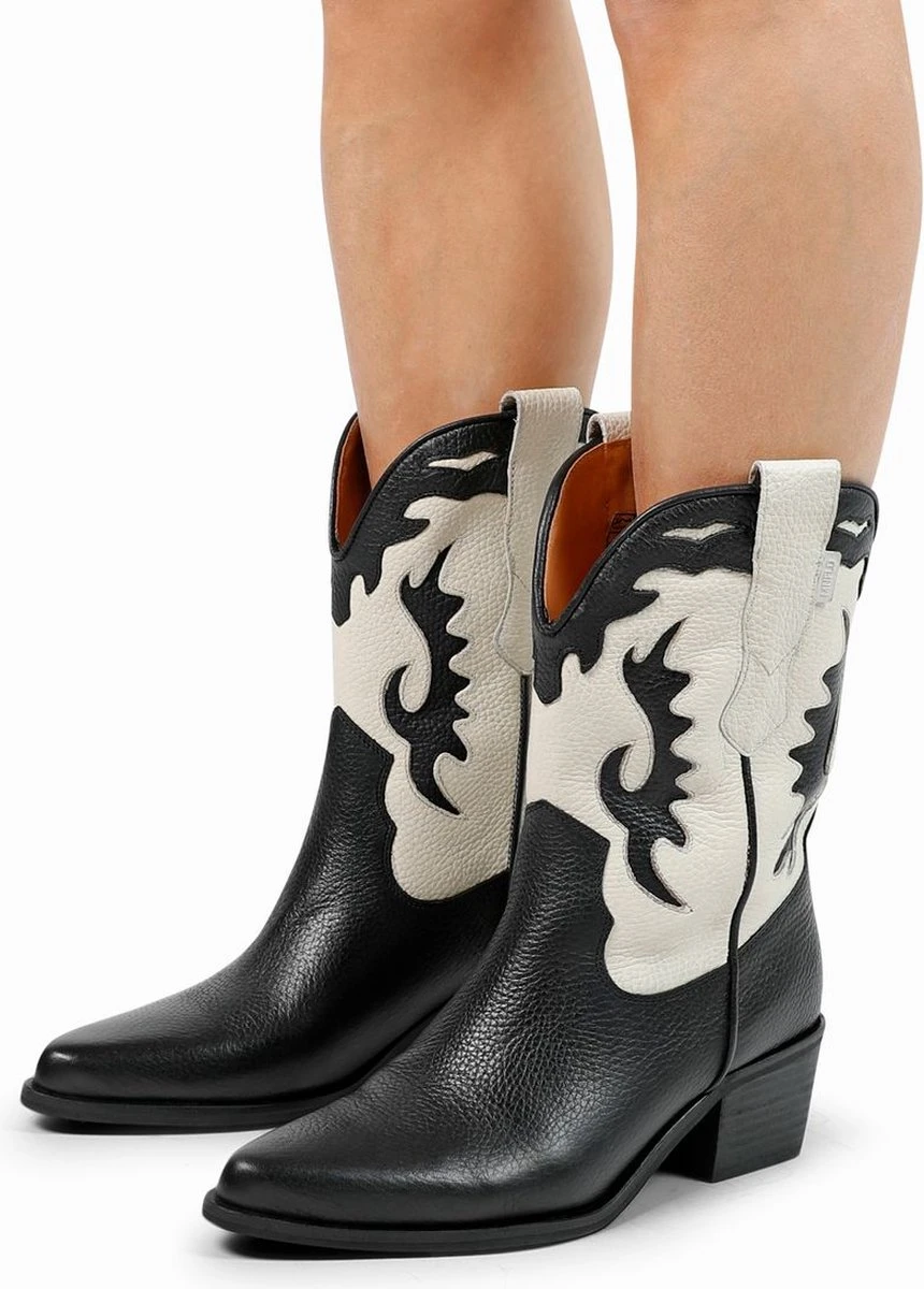 Zwarte leren cowboy laarzen met witte details van Manfield. Deze cowboylaarzen zijn gemaakt van leer, daarom raden we je aan deze cowboy laarzen te verzorgen en beschermen met de Collonil Carbon Pro. Deze cowboy laarzen zijn perfect te dragen van de lente tot en met de winter. De schacht heeft een hoogte van 25 cm, evenals de omtrek van de schacht. De hakken van de laarzen zijn 5 cm hoog.