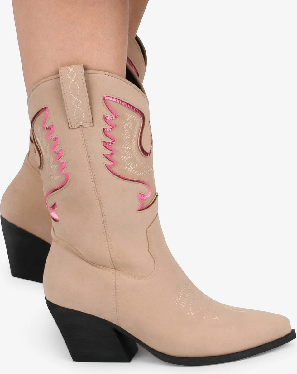 Deze cowboy geïnspireerde ‘BIBI’ enkellaarzen voor dames van POSH by Poelman hebben een bovenwerk van beige imitatie suède met metallic roze details en subtiele stiksel. Het model is voorzien van een ritssluiting en een hakje met een hoogte van 7 cm. Deze laars heeft een voering van microfiber en een comfortabel vast voetbed. Deze trendy western laars past helemaal in het huidige mode beeld. Perfect dus voor aankomend seizoen. Sinds 2021 is het label POSH by Poelman ontstaan. POSH by Poelman richt zich voornamelijk op betaalbare en trendy schoenen. Dit Nederlandse merk heeft altijd een on trend collectie met comfortabele musthaves. Bovendien zijn de sneakers, loafers, instappers en laarzen net even anders dan anders, zodat je voor iedere outfit een echte eyecatcher hebt.