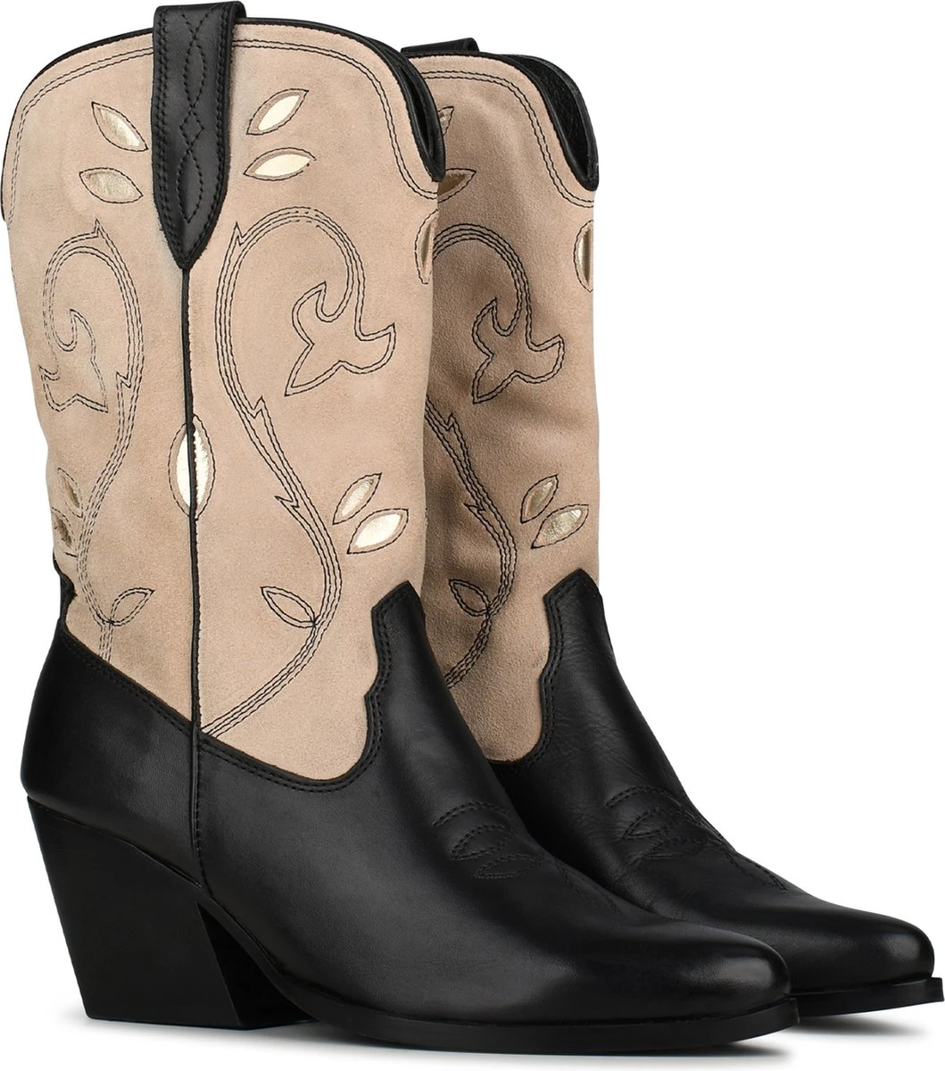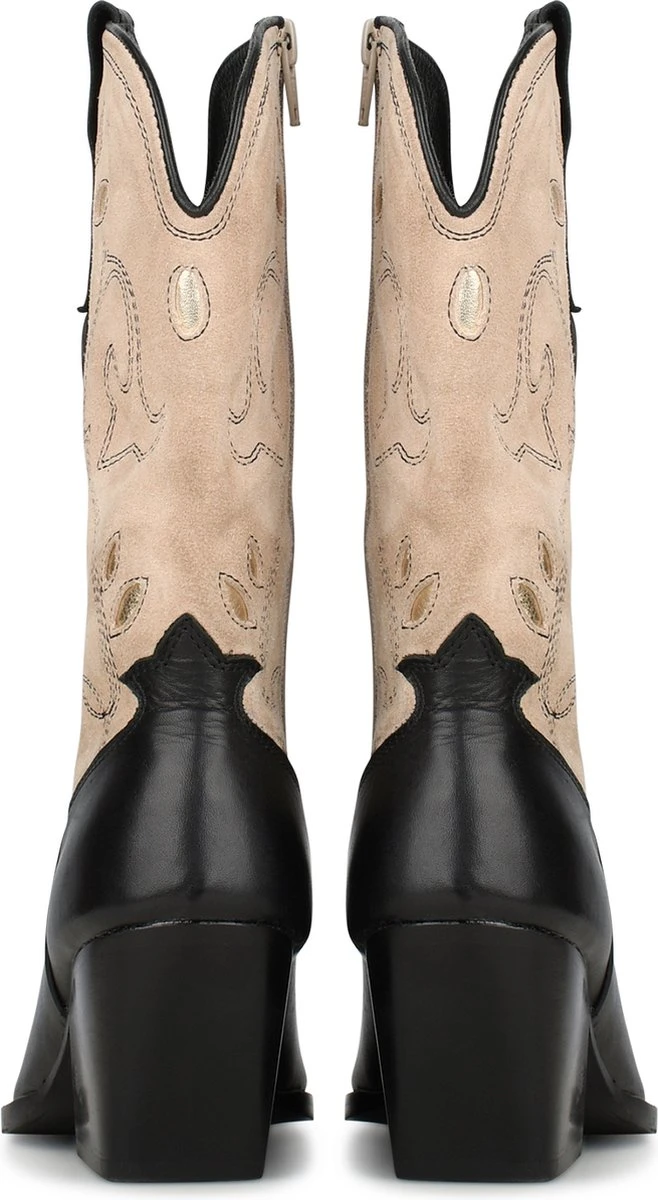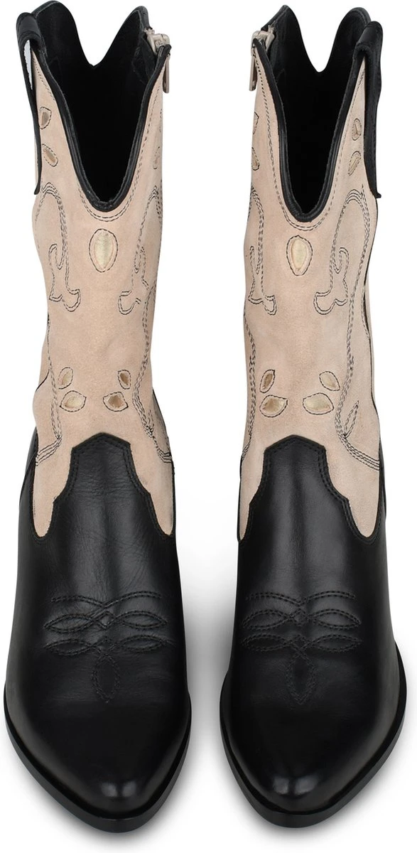 Deze cowboy geïnspireerde ‘LOLA’ laarzen voor dames van PS Poelman hebben een bovenwerk van leer en suède in de kleur zwart en beige. De decoratieve stiksel details geven deze western laarsjes een unieke twist. Het model is voorzien van een ritssluiting en een hakje met een hoogte van 7 cm. Deze boot heeft een voering van textiel en een vast voetbed. Perfect om te combineren onder een stoere spijkerbroek als een casual statement of klassiek en netjes onder een rok of pantalon. In 2015 werd het label PS Poelman in het leven geroepen. PS Poelman richt zich voornamelijk op een jonge doelgroep en reageert razendsnel op nieuwe trends. Trendy en comfortabel: dat zijn de schoenen van het hippe Nederlandse merk. Bovendien zijn de schoenen, sneakers en laarzen net even anders dan anders, zodat je voor iedere outfit een echte eyecatcher hebt.