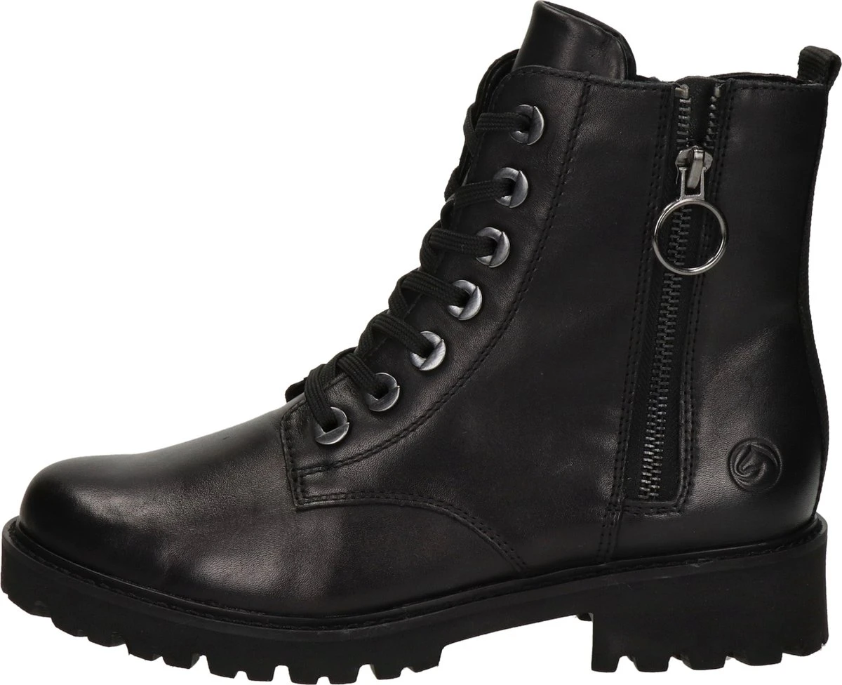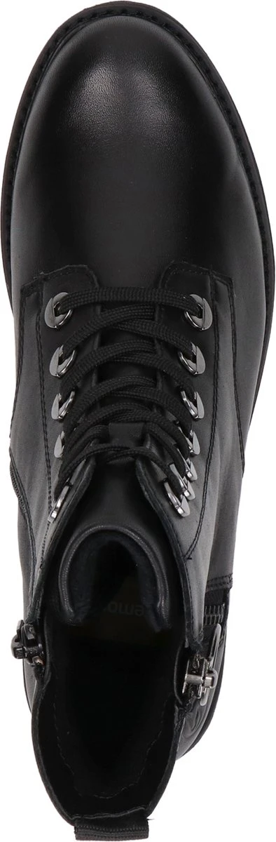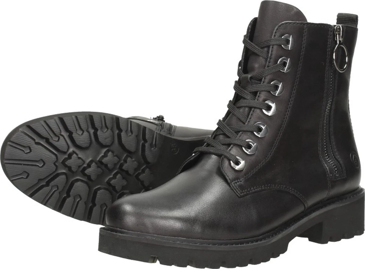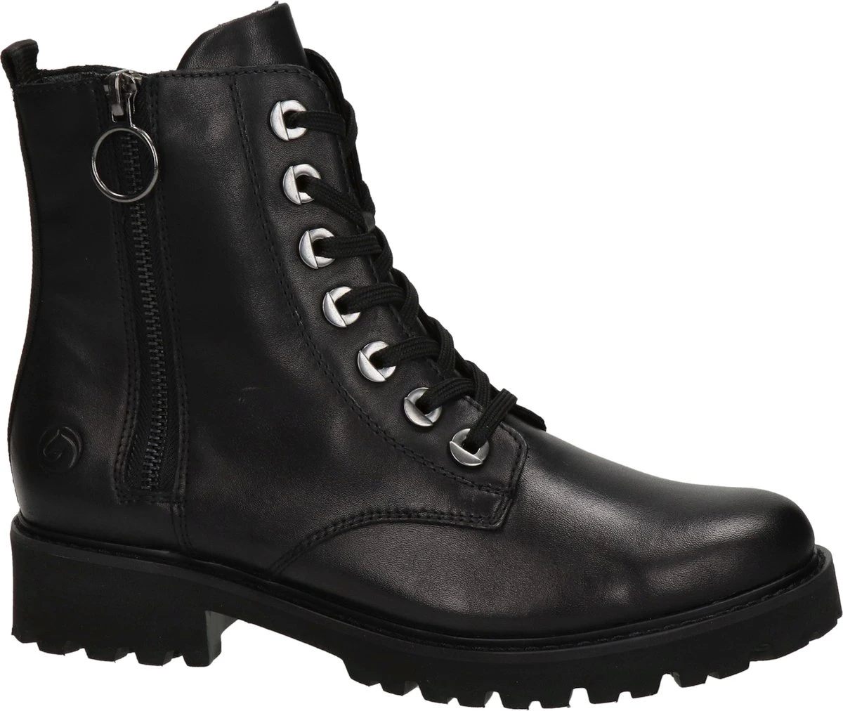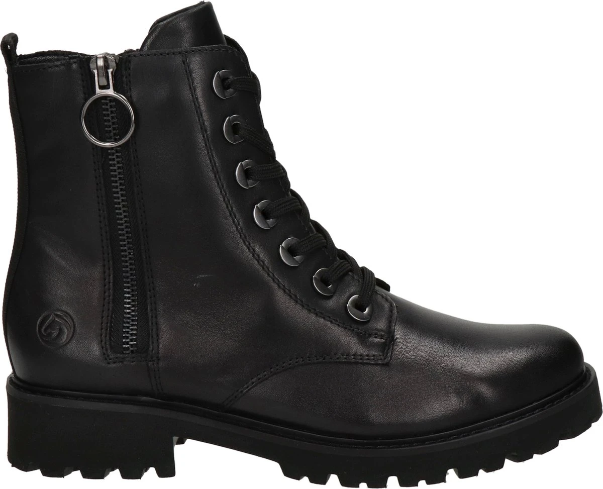 REMONTE artikel/model D8671-01 schwarz/black zijn modieuze zwarte damesschoenen stevige stoere veterboots, bikerboots of bottines of lace-up ankleboots van Remonte. Deze gemakkelijke Remonte hoge vrouwen bottines of boots zijn voorzien van zowel veters als een ritssluiting en hebben een ruime G-wijdte leest voor vrij brede voeten en een losse binnenzool en zijn dus ook geschikt voor steunzolen. Makkelijk aan en uit door de rits en de wijd regelbare schacht. Hoge kwaliteit voor een zachte prijs.