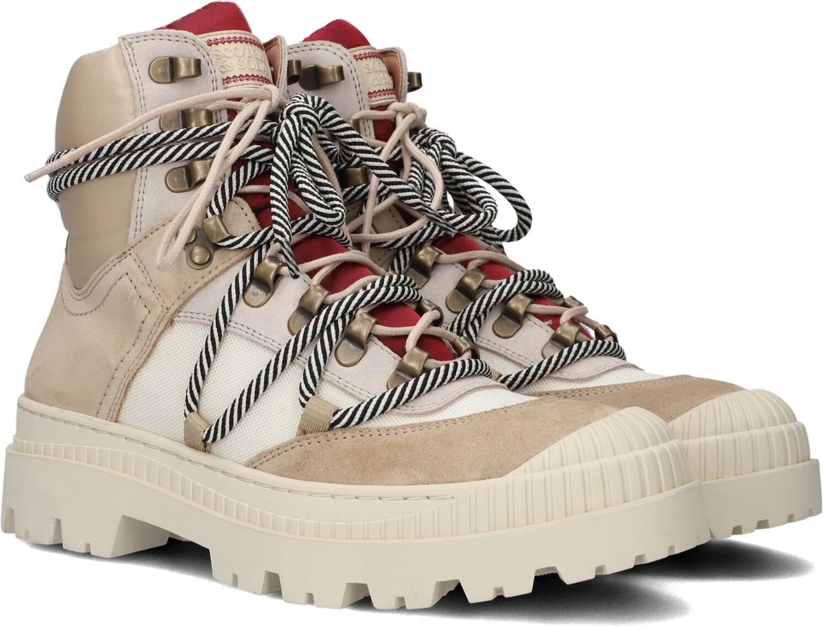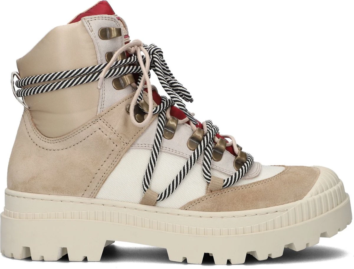 Van het Amsterdamse couture-merk Scotch & Soda is deze beige veterboot Conni MID met hiking-geïnspireerde accenten zoals de ronde neus met rubberen stootrand, de extra hoge enkelkraag en de bronskleurige veterhaken. Met deze stoere boot ga je helemaal mee met de laatste fAshion trend, namelijk; gorpcore. Deze nieuwe trend richt zich voornamelijk op kleding en schoenen die je uitnodigen om de natuur in te gaan, maar dan met een fAshion twist. En dit model hoort erbij! De schoen is gemaakt van beige suède in combinatie met strak geweven textiel en heeft zijn stoere uiterlijk te danken aan de rode tong van nylon en de twee verschillende soorten veters. De rubberen zool is voorzien van een grof reliëf die zijn stoere look benadrukt. Op de tong bevindt zich een rubber merklabel en de achterkant van de schoen is voorzien van een textiel aantreklusje. Het binnenwerk is van gevoerd leer en heeft een uitneembaar voetbed met dempende schuimlaag voor extra comfort. De extra dikke zool is ruim 3,5 centimeter dik onder de voorvoet en heeft een hakhoogte van 5 centimeter. Een supertoffe boot voor een unieke look onder iedere toffe outfit die jij bedenkt!