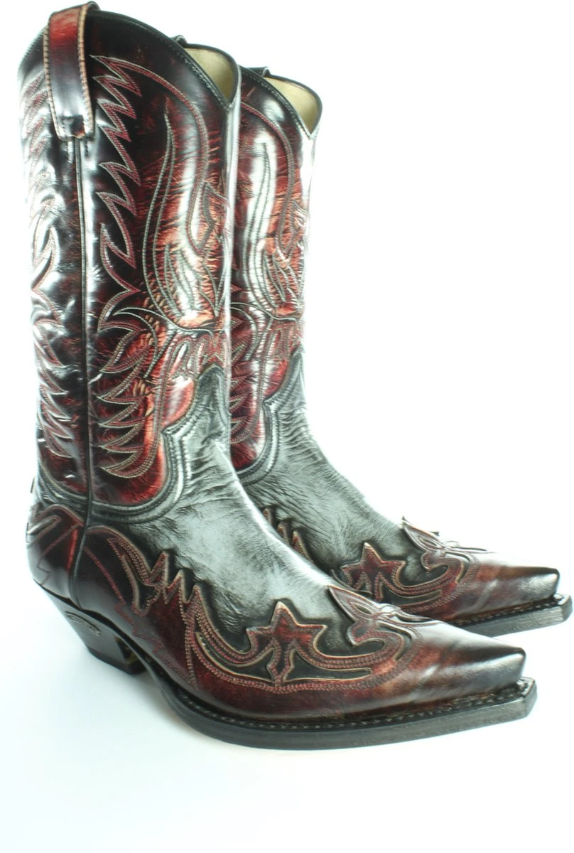 Western laars met een spitse neus en een echte “mexicaanse” hak. De hak, Ibiza, is extra schuin aan de achterkant. Het leer, Denver, is glanzend en heeft een hele mooie vintage look.