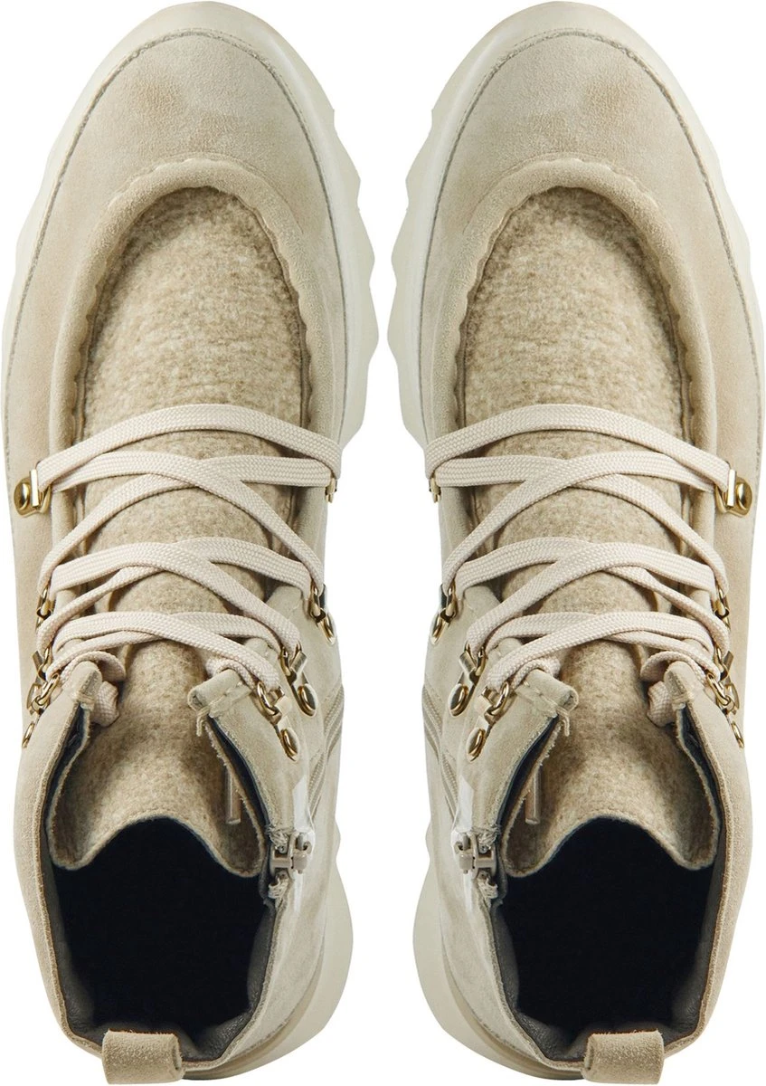 Enkellaars met ronde neus is uitgevoerd in suède en vacht. Deze enkelhoge laars met ronde neus is uitgevoerd in gebroken wit. De schoen bestaat zowel uit stof als suède . De platte veters die door goudkleurige ringen zijn geregen. De binnenkant is uitgevoerd in leer en een stevig contrefort draagt bij aan het loopgemak. De rubberen loopzool heeft een grof profiel voor stevige grip.