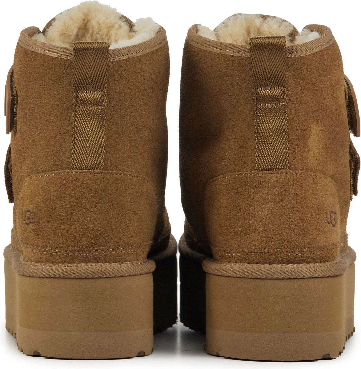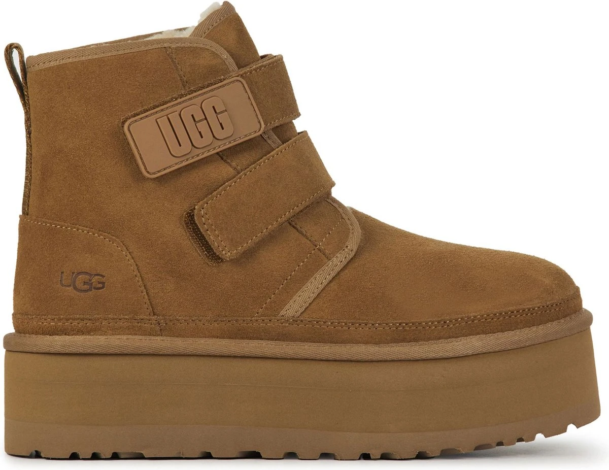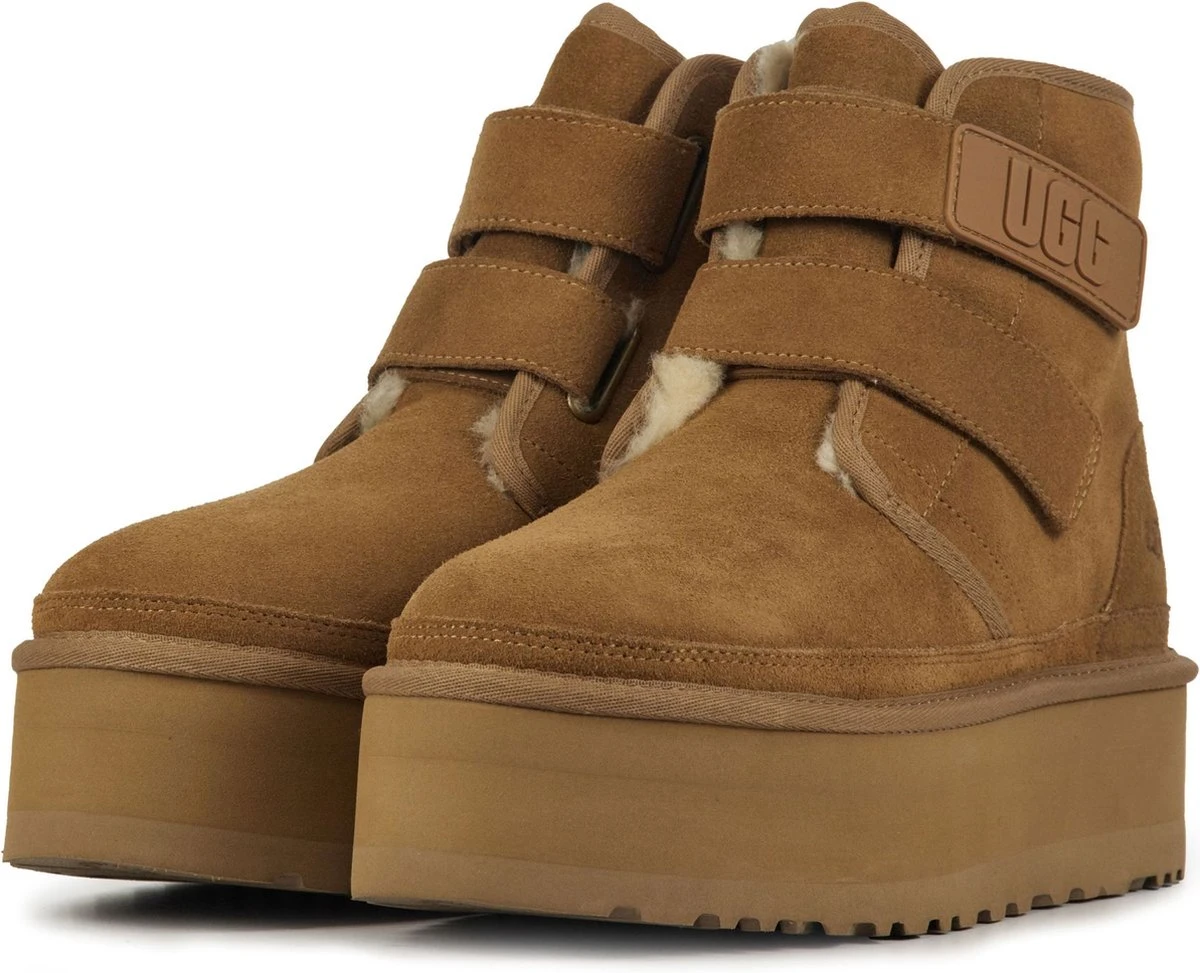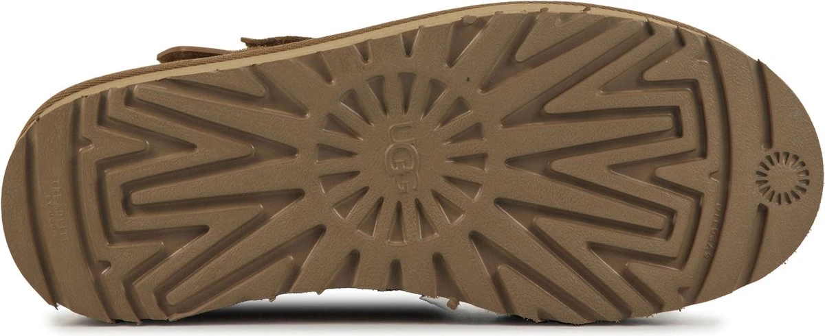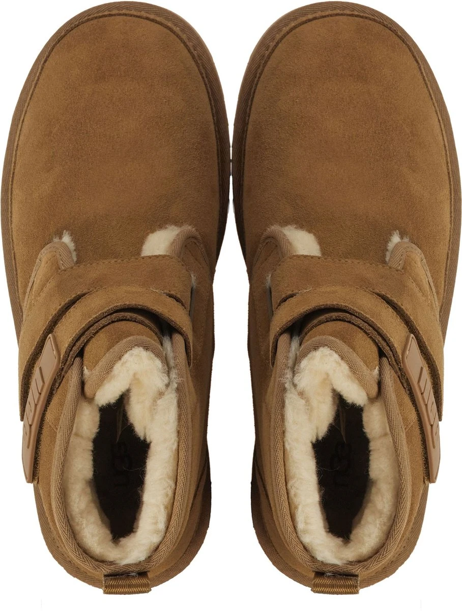 Cognac suède enkellaars voor dames van het merk UGG. Dit iconische model is aan de buitenkant vervaardigd uit suède en voorbehandeld met vlek- en waterafstotende middelen. De binnenvoering is gemaakt van het welbekende schaapswol waardoor de voeten altijd verwarmd zijn. De treklus op de achterbies en het klittenband op de voorzijde helpt het aan- en uittrekken te versoepelen. Verder biedt de dikke rubberen Treadlite by UGG™-zool extra demping en heeft deze een grof profiel voor een stevige grip.